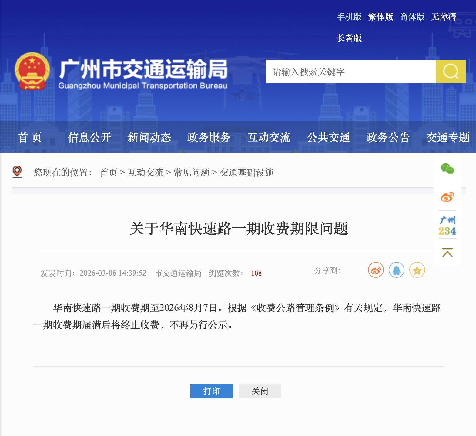 据多方消息,华南快速路一期收费期至2026年8月7日。在广州市交通运输局一则关于该快速路收费的问题回复中提到,“华南快速路一期收费期至2026年8月7日。根据《收费公路管理条例》有关规定,华南快速路一期收费期届满后将终止收费,不再另行公示。”