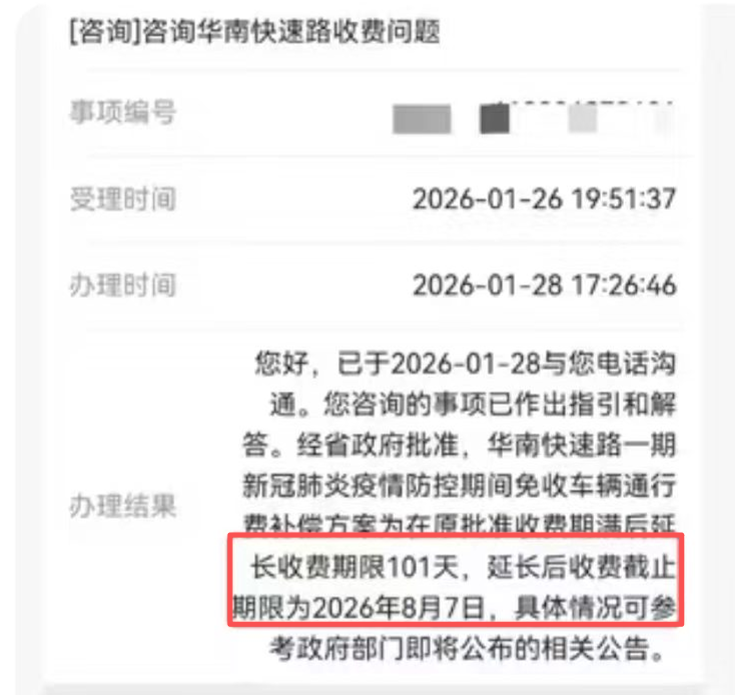 12345热线对华快收费问题的回复也提到,“经省政府批准,华南快速路一期新冠疫情防控期间免收车辆通行费补偿方案为在原批准收费期满后延长收费期限101天,延长后收费截止期限为2026年8月7日”。